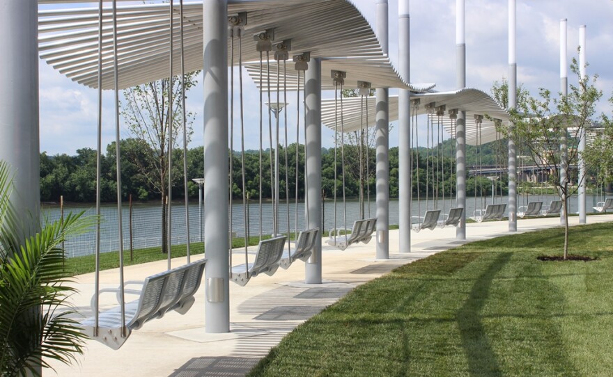 These swings facing the Ohio River are a favorite photo spot. Relax here while enjoying the scenic riverfront views.